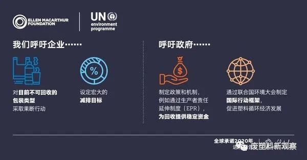 基於上述發現,艾倫(lún)·麥克阿瑟基金會和聯合國(guó)環境署發出破除(chú)塑料汙染的四大呼籲: